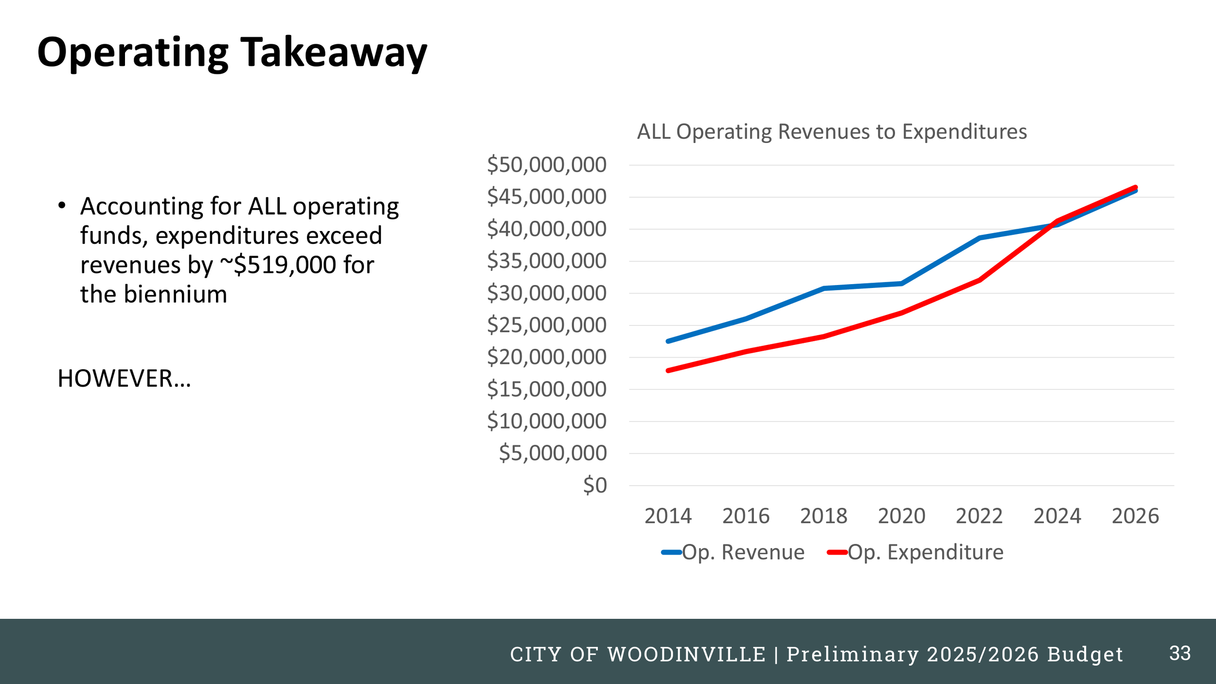 Slide from the October 15th, 2024 Woodinville City Council meeting showing a $519,000 operating deficit.